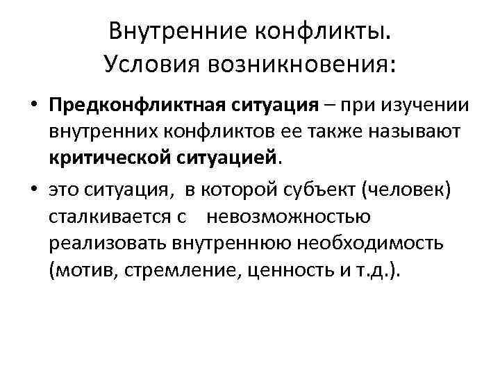 Внутренние конфликты. Условия возникновения: • Предконфликтная ситуация – при изучении внутренних конфликтов ее также называют критической ситуацией. • это ситуация, в которой субъект (человек) сталкивается с невозможностью реализовать внутреннюю необходимость (мотив, стремление, ценность и т. д. ).