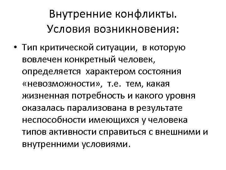 Внутренние конфликты. Условия возникновения: • Тип критической ситуации, в которую вовлечен конкретный человек, определяется характером состояния «невозможности» , т. е. тем, какая жизненная потребность и какого уровня оказалась парализована в результате неспособности имеющихся у человека типов активности справиться с внешними и внутренними условиями.