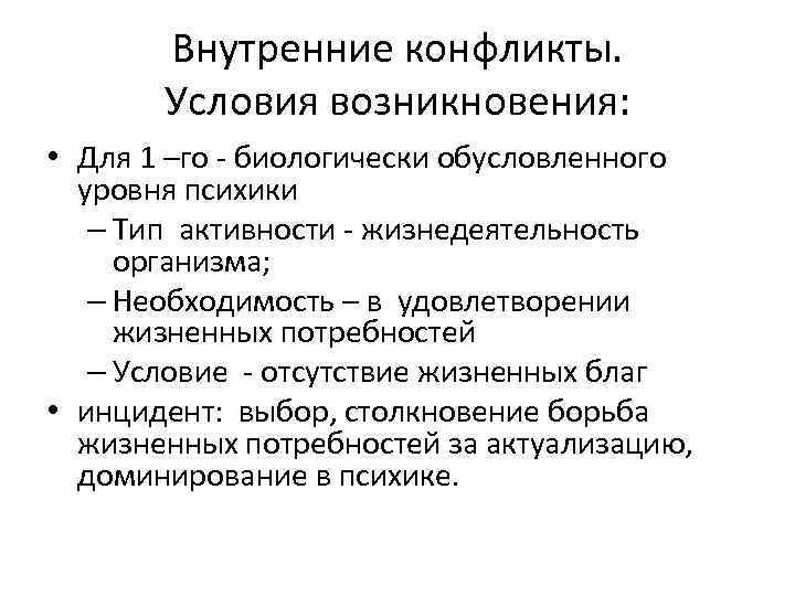 Внутренние конфликты. Условия возникновения: • Для 1 –го - биологически обусловленного уровня психики – Тип активности - жизнедеятельность организма; – Необходимость – в удовлетворении жизненных потребностей – Условие - отсутствие жизненных благ • инцидент: выбор, столкновение борьба жизненных потребностей за актуализацию, доминирование в психике.