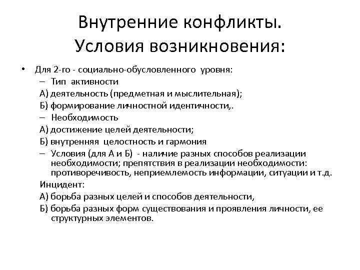 Внутренние конфликты. Условия возникновения: • Для 2 -го - социально-обусловленного уровня: – Тип активности А) деятельность (предметная и мыслительная); Б) формирование личностной идентичности, . – Необходимость А) достижение целей деятельности; Б) внутренняя целостность и гармония – Условия (для А и Б) - наличие разных способов реализации необходимости; препятствия в реализации необходимости: противоречивость, неприемлемость информации, ситуации и т. д. Инцидент: А) борьба разных целей и способов деятельности, Б) борьба разных форм существования и проявления личности, ее структурных элементов.