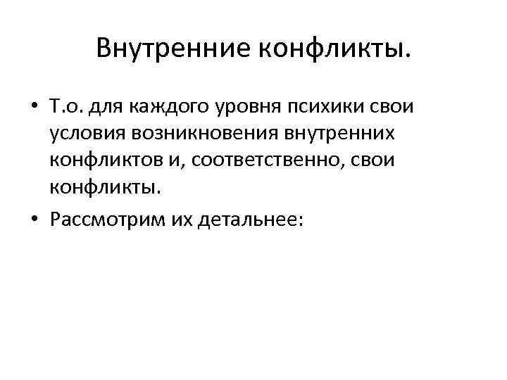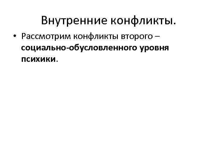 Внутренние конфликты. • Т. о. для каждого уровня психики свои условия возникновения внутренних конфликтов и, соответственно, свои конфликты. • Рассмотрим их детальнее:
