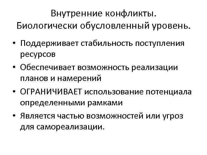 Внутренние конфликты. Биологически обусловленный уровень. • Поддерживает стабильность поступления ресурсов • Обеспечивает возможность реализации планов и намерений • ОГРАНИЧИВАЕТ использование потенциала определенными рамками • Является частью возможностей или угроз для самореализации.