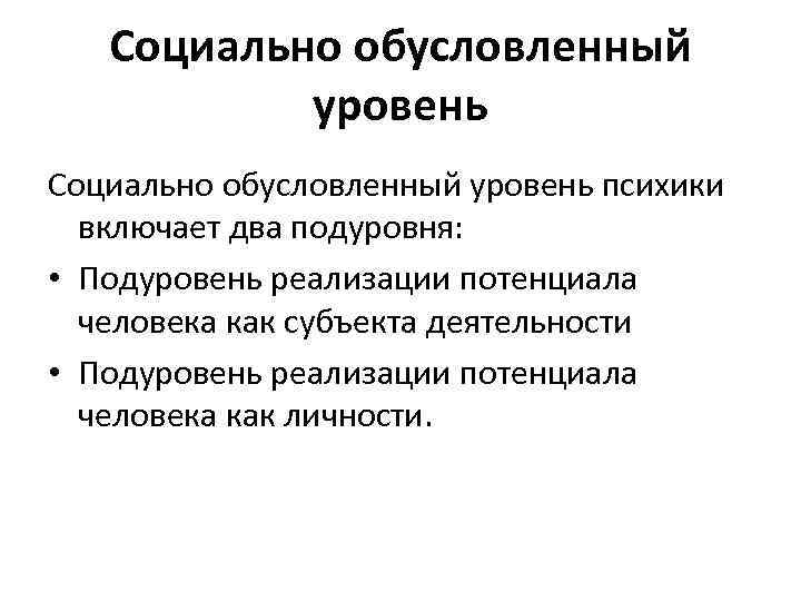 Социально обусловленный уровень психики включает два подуровня: • Подуровень реализации потенциала человека как субъекта деятельности • Подуровень реализации потенциала человека как личности.