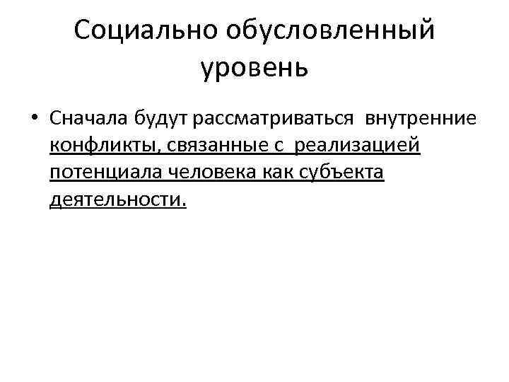 Социально обусловленный уровень • Сначала будут рассматриваться внутренние конфликты, связанные с реализацией потенциала человека как субъекта деятельности.