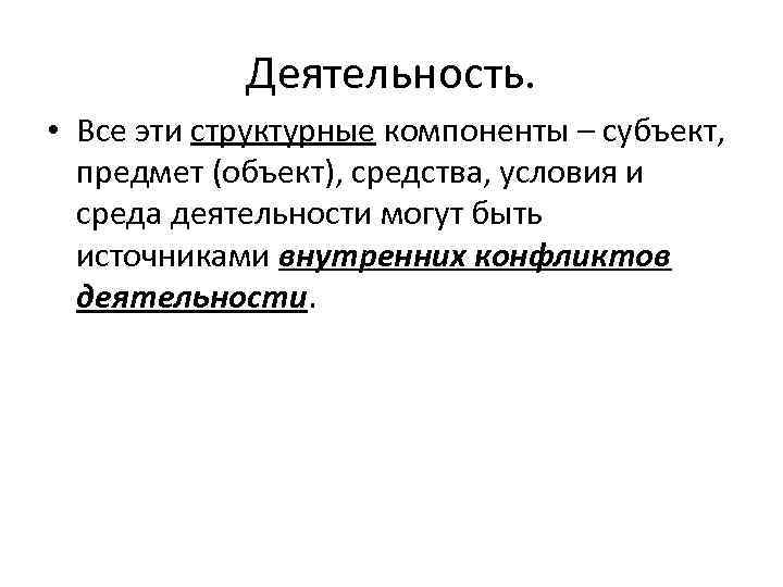 Деятельность. • Все эти структурные компоненты – субъект, предмет (объект), средства, условия и среда деятельности могут быть источниками внутренних конфликтов деятельности.