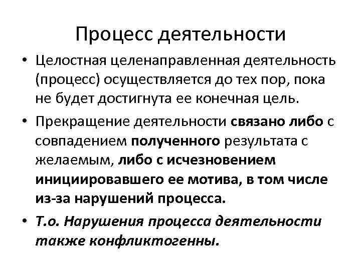 Процесс деятельности • Целостная целенаправленная деятельность (процесс) осуществляется до тех пор, пока не будет достигнута ее конечная цель. • Прекращение деятельности связано либо с совпадением полученного результата с желаемым, либо с исчезновением инициировавшего ее мотива, в том числе из-за нарушений процесса. • Т. о. Нарушения процесса деятельности также конфликтогенны.