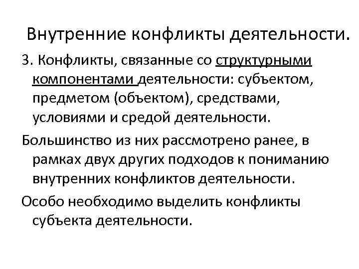 Внутренние конфликты деятельности. 3. Конфликты, связанные со структурными компонентами деятельности: субъектом, предметом (объектом), средствами, условиями и средой деятельности. Большинство из них рассмотрено ранее, в рамках двух других подходов к пониманию внутренних конфликтов деятельности. Особо необходимо выделить конфликты субъекта деятельности.