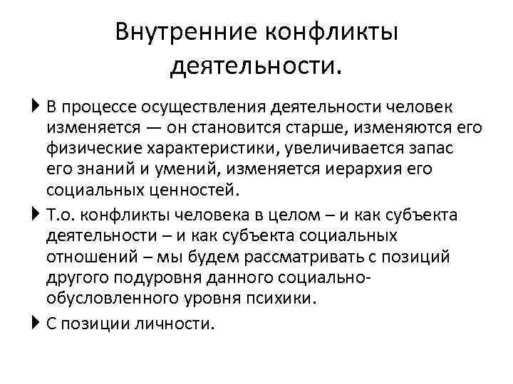 Внутренние конфликты деятельности. В процессе осуществления деятельности человек изменяется — он становится старше, изменяются его физические характеристики, увеличивается запас его знаний и умений, изменяется иерархия его социальных ценностей. Т. о. конфликты человека в целом – и как субъекта деятельности – и как субъекта социальных отношений – мы будем рассматривать с позиций другого подуровня данного социальнообусловленного уровня психики. С позиции личности.