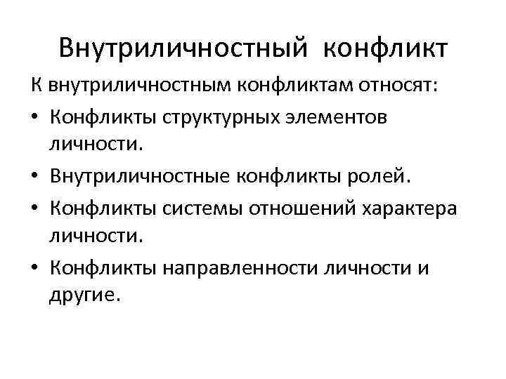 Внутриличностный конфликт К внутриличностным конфликтам относят: • Конфликты структурных элементов личности. • Внутриличностные конфликты ролей. • Конфликты системы отношений характера личности. • Конфликты направленности личности и другие.