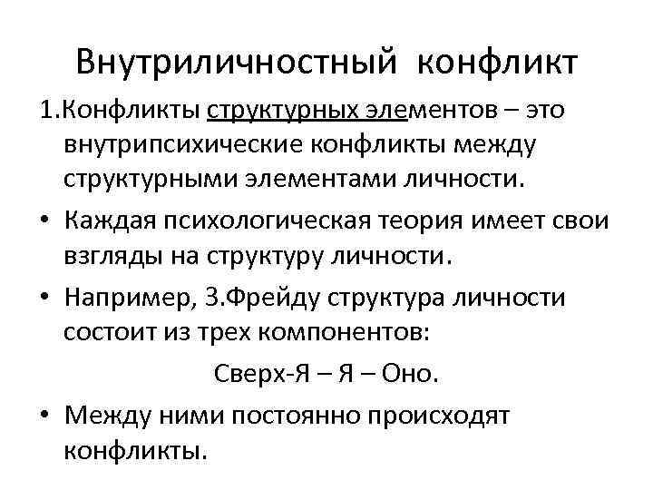 Внутриличностный конфликт 1. Конфликты структурных элементов – это внутрипсихические конфликты между структурными элементами личности. • Каждая психологическая теория имеет свои взгляды на структуру личности. • Например, З. Фрейду структура личности состоит из трех компонентов: Сверх-Я – Оно. • Между ними постоянно происходят конфликты.