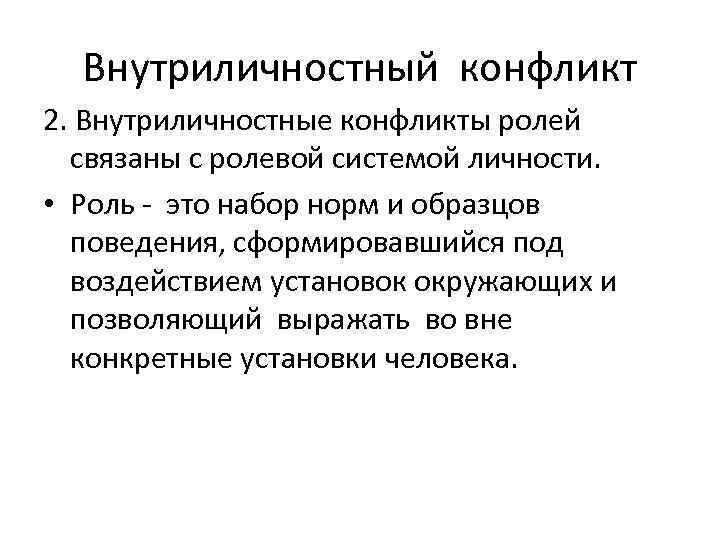 Внутриличностный конфликт 2. Внутриличностные конфликты ролей связаны с ролевой системой личности. • Роль - это набор норм и образцов поведения, сформировавшийся под воздействием установок окружающих и позволяющий выражать во вне конкретные установки человека.