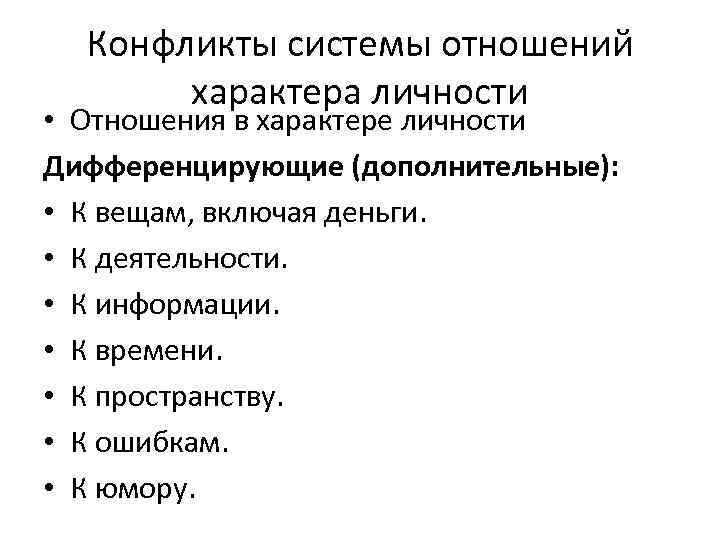 Конфликты системы отношений характера личности • Отношения в характере личности Дифференцирующие (дополнительные): • К вещам, включая деньги. • К деятельности. • К информации. • К времени. • К пространству. • К ошибкам. • К юмору.