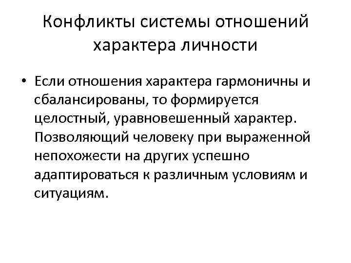 Конфликты системы отношений характера личности • Если отношения характера гармоничны и сбалансированы, то формируется целостный, уравновешенный характер. Позволяющий человеку при выраженной непохожести на других успешно адаптироваться к различным условиям и ситуациям.