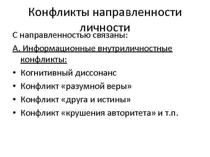 Конфликты направленности личности С направленностью связаны: А. Информационные внутриличностные конфликты: • Когнитивный диссонанс • Конфликт «разумной веры» • Конфликт «друга и истины» • Конфликт «крушения авторитета» и т. п.