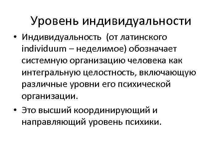 Уровень индивидуальности • Индивидуальность (от латинского individuum – неделимое) обозначает системную организацию человека как интегральную целостность, включающую различные уровни его психической организации. • Это высший координирующий и направляющий уровень психики.