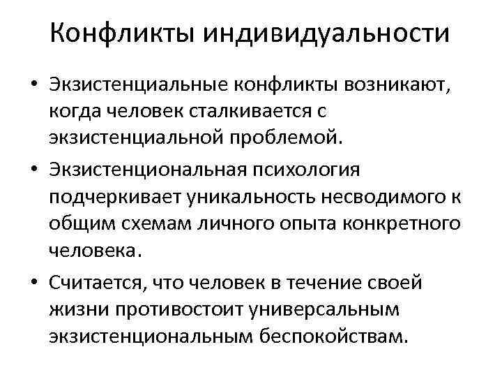 Конфликты индивидуальности • Экзистенциальные конфликты возникают, когда человек сталкивается с экзистенциальной проблемой. • Экзистенциональная психология подчеркивает уникальность несводимого к общим схемам личного опыта конкретного человека. • Считается, что человек в течение своей жизни противостоит универсальным экзистенциональным беспокойствам.