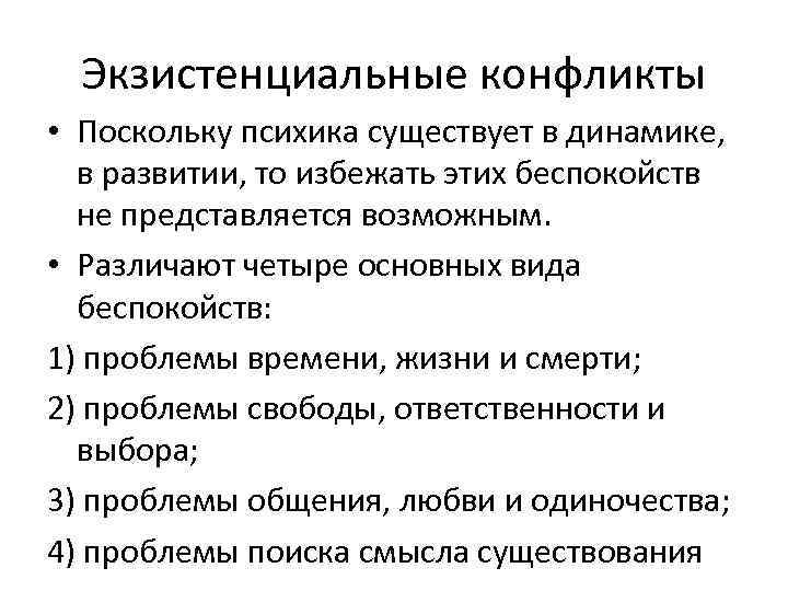 Экзистенциальные конфликты • Поскольку психика существует в динамике, в развитии, то избежать этих беспокойств не представляется возможным. • Различают четыре основных вида беспокойств: 1) проблемы времени, жизни и смерти; 2) проблемы свободы, ответственности и выбора; 3) проблемы общения, любви и одиночества; 4) проблемы поиска смысла существования