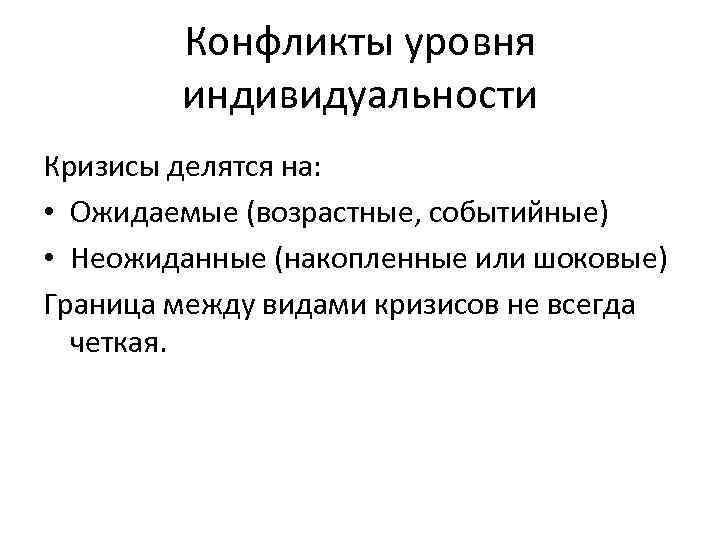 Конфликты уровня индивидуальности Кризисы делятся на: • Ожидаемые (возрастные, событийные) • Неожиданные (накопленные или шоковые) Граница между видами кризисов не всегда четкая.