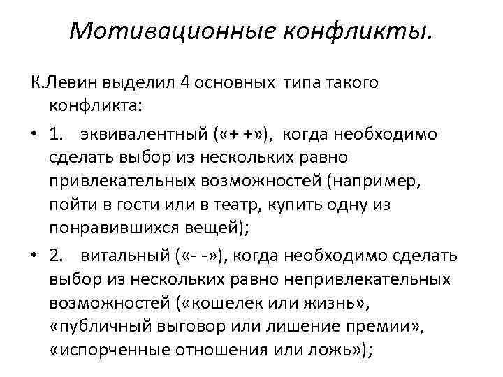 Мотивационные конфликты. К. Левин выделил 4 основных типа такого конфликта: • 1. эквивалентный ( «+ +» ), когда необходимо сделать выбор из нескольких равно привлекательных возможностей (например, пойти в гости или в театр, купить одну из понравившихся вещей); • 2. витальный ( «- -» ), когда необходимо сделать выбор из нескольких равно непривлекательных возможностей ( «кошелек или жизнь» , «публичный выговор или лишение премии» , «испорченные отношения или ложь» );
