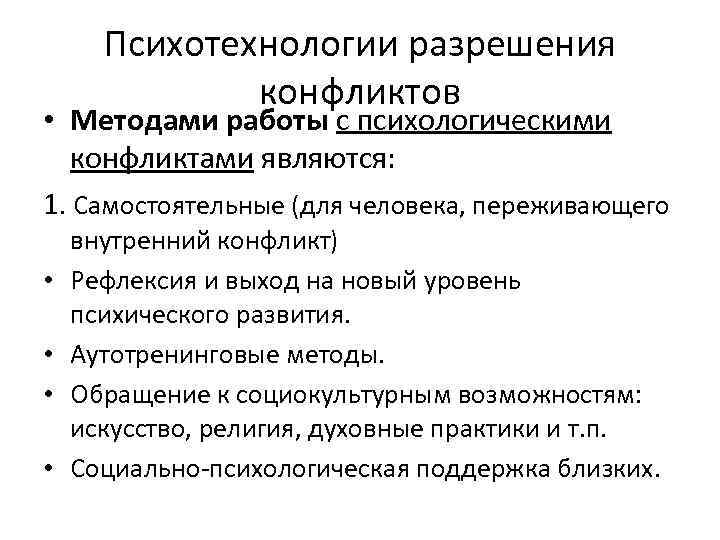 Психотехнологии разрешения конфликтов • Методами работы с психологическими конфликтами являются: 1. Самостоятельные (для человека, переживающего • • внутренний конфликт) Рефлексия и выход на новый уровень психического развития. Аутотренинговые методы. Обращение к социокультурным возможностям: искусство, религия, духовные практики и т. п. Социально-психологическая поддержка близких.