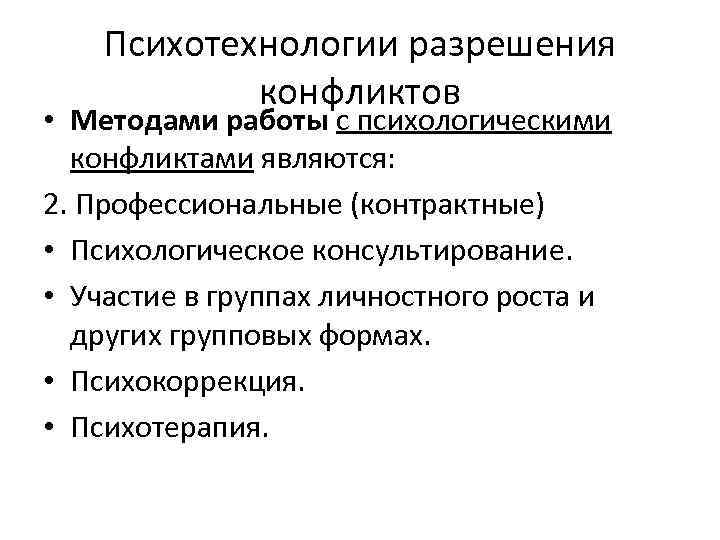 Психотехнологии разрешения конфликтов • Методами работы с психологическими конфликтами являются: 2. Профессиональные (контрактные) • Психологическое консультирование. • Участие в группах личностного роста и других групповых формах. • Психокоррекция. • Психотерапия.