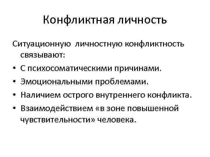 Конфликтная личность Ситуационную личностную конфликтность связывают: • С психосоматическими причинами. • Эмоциональными проблемами. • Наличием острого внутреннего конфликта. • Взаимодействием «в зоне повышенной чувствительности» человека.