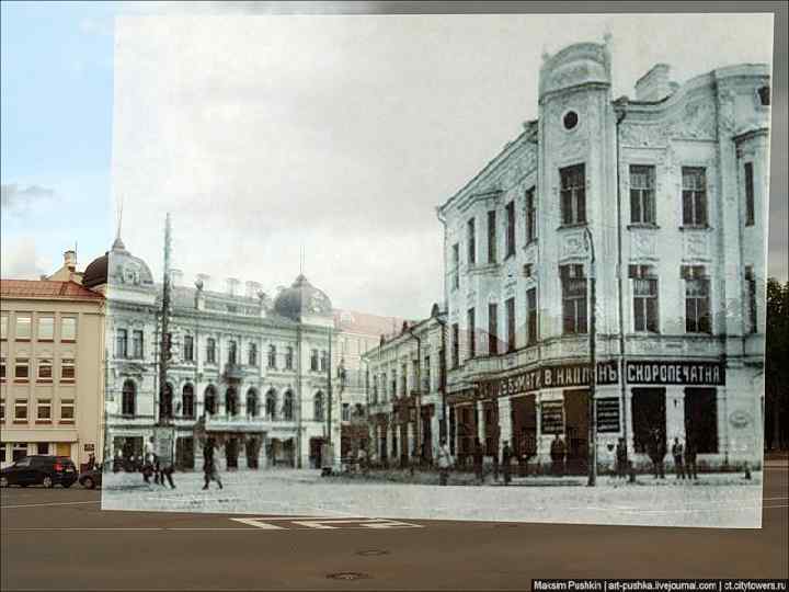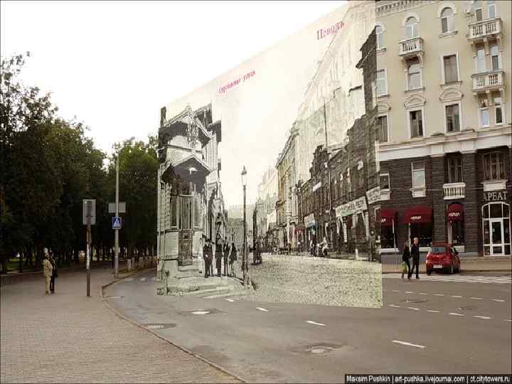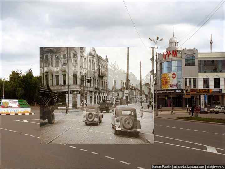 Наши герои на Углах. Впереди мост. За ним виден сгоревший Гостинный двор. Мост взорван, поэтому колонна поворачивает направо, по Интернациональной улице (ныне ул. М. Горького). Понтонный мост там.