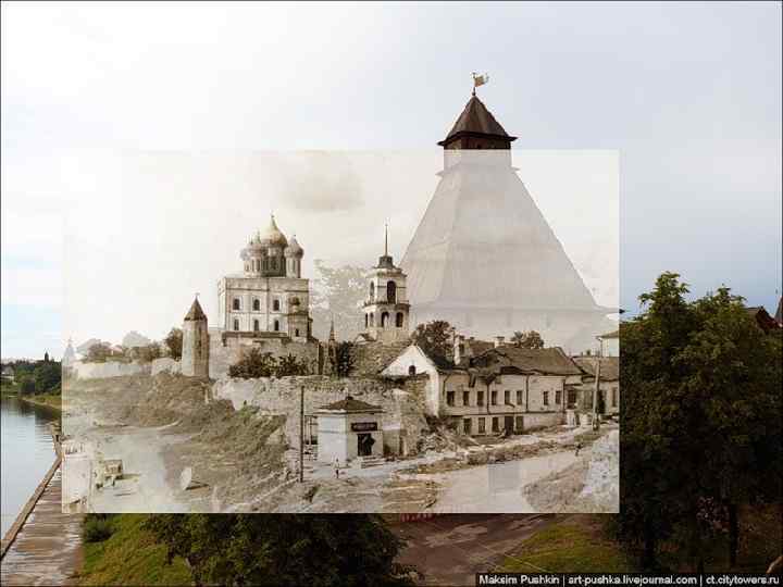 Троицкий собор, колокольня и Довмонтова башня. Фото с моста Красной армии.
