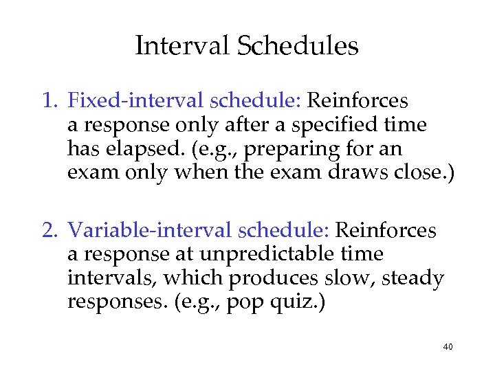 Ratio Schedules 1. Fixed-ratio schedule: Reinforces a response only after a specified number of responses. e. g. , piecework pay. 2. Variable-ratio schedule: Reinforces a response after an unpredictable number of responses. This is hard to extinguish because of the unpredictability. (e. g. , behaviors like gambling, fishing. ) 39