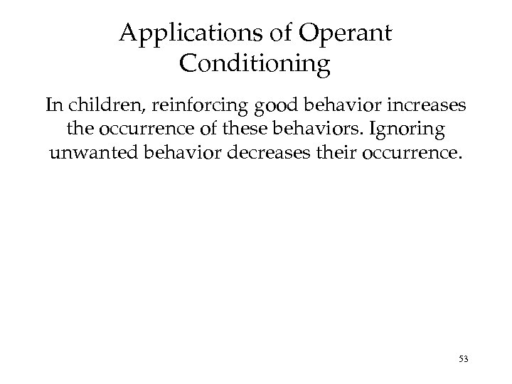 Applications of Operant Conditioning In children, reinforcing good behavior increases the occurrence of these behaviors. Ignoring unwanted behavior decreases their occurrence. 53