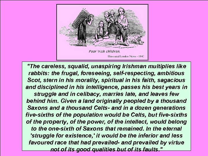 "The careless, squalid, unaspiring Irishman multiplies like rabbits: the frugal, foreseeing, self-respecting, ambitious Scot, stern in his morality, spiritual in his faith, sagacious and disciplined in his intelligence, passes his best years in struggle and in celibacy, marries late, and leaves few behind him. Given a land originally peopled by a thousand Saxons and a thousand Celts- and in a dozen generations five-sixths of the population would be Celts, but five-sixths of the property, of the power, of the intellect, would belong to the one-sixth of Saxons that remained. In the eternal 'struggle for existence, ' it would be the inferior and less favoured race that had prevailed- and prevailed by virtue not of its good qualities but of its faults. "