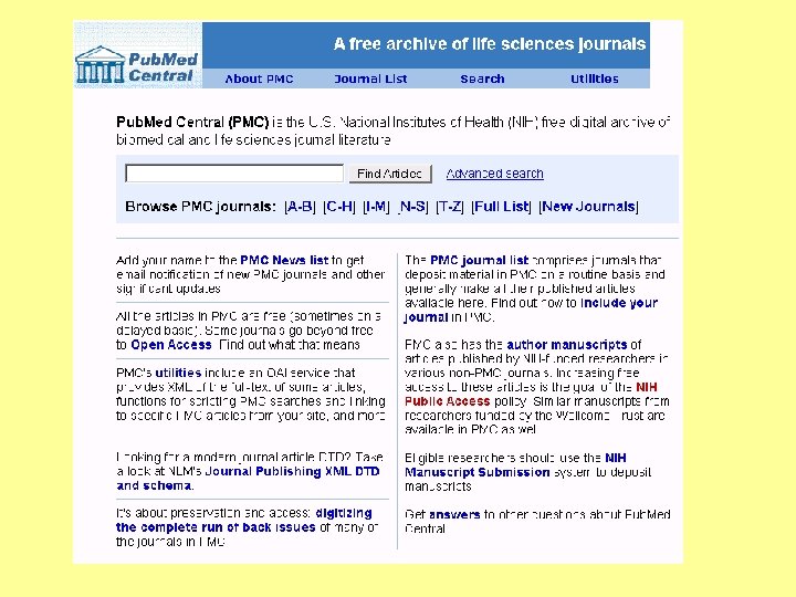 PMC Philosophy & Function • A logical extension of NLM’s general mandate • Digitize journal back issues to create a full electronic record of a journal • Provide free and unrestricted access to PMC, which ensures durability and utility of the archive as technology changes over time • Follow in the footsteps of other major NCBI resources • Integrate the literature with other valuable information resources in the database family – Pub. Med, Nucleotide, etc.