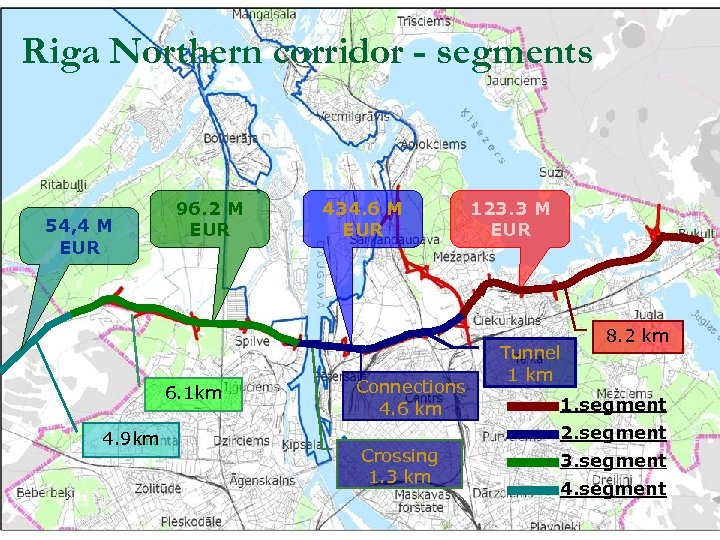 Riga Northern corridor - segments 54, 4 M EUR 96. 2 M EUR 6. 1 km 4. 9 km 434. 6 M EUR Connections 4. 6 km 123. 3 M EUR Tunnel 1 km 8. 2 km 1. segment 2. segment Crossing 1. 3 km 3. segment 4. segment