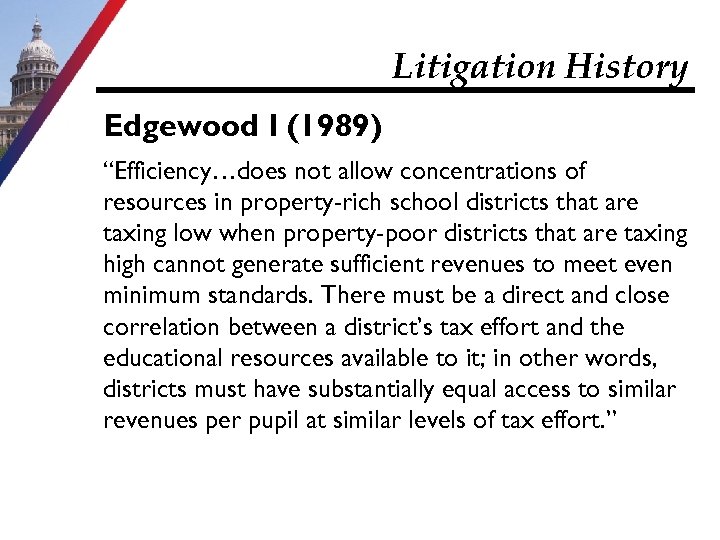 Litigation History Edgewood I (1989) “Efficiency…does not allow concentrations of resources in property-rich school districts that are taxing low when property-poor districts that are taxing high cannot generate sufficient revenues to meet even minimum standards. There must be a direct and close correlation between a district’s tax effort and the educational resources available to it; in other words, districts must have substantially equal access to similar revenues per pupil at similar levels of tax effort. ”