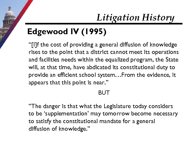 Litigation History Edgewood IV (1995) “[I]f the cost of providing a general diffusion of knowledge rises to the point that a district cannot meet its operations and facilities needs within the equalized program, the State will, at that time, have abdicated its constitutional duty to provide an efficient school system…From the evidence, it appears that this point is near. ” BUT “The danger is that what the Legislature today considers to be ‘supplementation’ may tomorrow become necessary to satisfy the constitutional mandate for a general diffusion of knowledge. ”