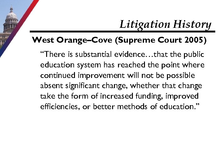 Litigation History West Orange–Cove (Supreme Court 2005) “There is substantial evidence…that the public education system has reached the point where continued improvement will not be possible absent significant change, whether that change take the form of increased funding, improved efficiencies, or better methods of education. ”