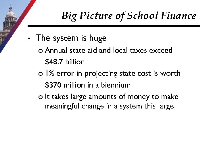 Big Picture of School Finance • The system is huge o Annual state aid and local taxes exceed $48. 7 billion o 1% error in projecting state cost is worth $370 million in a biennium o It takes large amounts of money to make meaningful change in a system this large