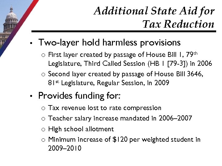 Additional State Aid for Tax Reduction • Two-layer hold harmless provisions o First layer created by passage of House Bill 1, 79 th Legislature, Third Called Session (HB 1 [79 -3]) in 2006 o Second layer created by passage of House Bill 3646, 81 st Legislature, Regular Session, in 2009 • Provides funding for: o o Tax revenue lost to rate compression Teacher salary increase mandated in 2006– 2007 High school allotment Minimum increase of $120 per weighted student in 2009– 2010