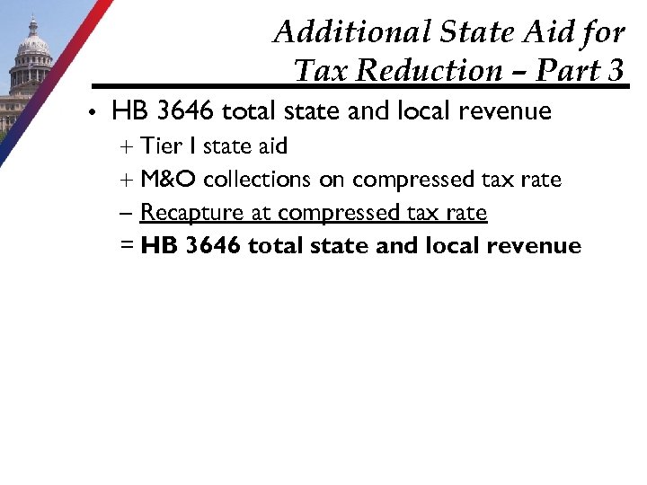 Additional State Aid for Tax Reduction – Part 3 HB 3646 total state and local revenue Tier I state aid M&O collections on compressed tax rate – Recapture at compressed tax rate = HB 3646 total state and local revenue