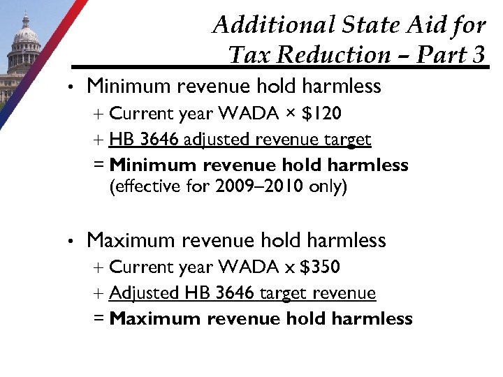 Additional State Aid for Tax Reduction – Part 3 • Minimum revenue hold harmless Current year WADA × $120 HB 3646 adjusted revenue target = Minimum revenue hold harmless (effective for 2009– 2010 only) • Maximum revenue hold harmless Current year WADA x $350 Adjusted HB 3646 target revenue = Maximum revenue hold harmless