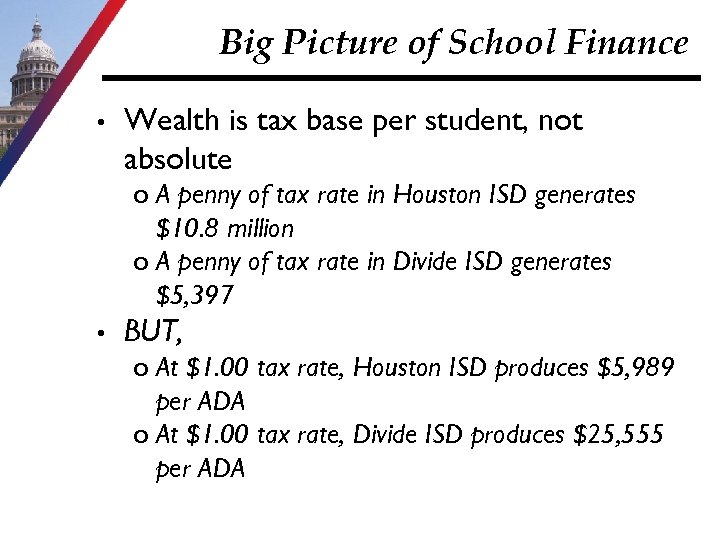 Big Picture of School Finance • Wealth is tax base per student, not absolute o A penny of tax rate in Houston ISD generates $10. 8 million o A penny of tax rate in Divide ISD generates $5, 397 • BUT, o At $1. 00 tax rate, Houston ISD produces $5, 989 per ADA o At $1. 00 tax rate, Divide ISD produces $25, 555 per ADA