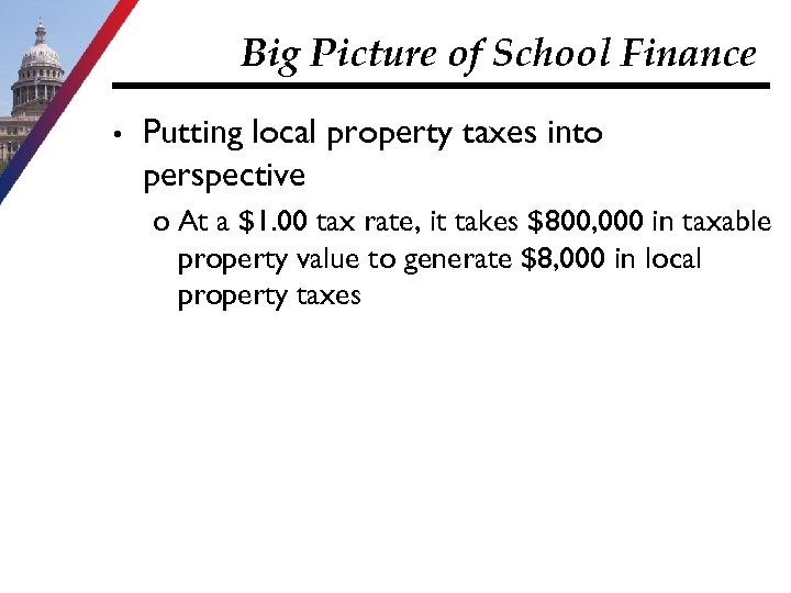 Big Picture of School Finance • Putting local property taxes into perspective o At a $1. 00 tax rate, it takes $800, 000 in taxable property value to generate $8, 000 in local property taxes