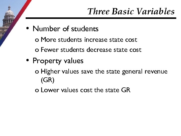 Three Basic Variables • Number of students o More students increase state cost o Fewer students decrease state cost • Property values o Higher values save the state general revenue (GR) o Lower values cost the state GR