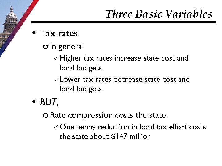 Three Basic Variables • Tax rates o In general ü Higher tax rates increase state cost and local budgets ü Lower tax rates decrease state cost and local budgets • BUT, o Rate compression costs the state ü One penny reduction in local tax effort costs the state about $147 million