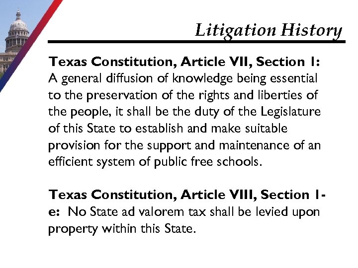 Litigation History Texas Constitution, Article VII, Section 1: A general diffusion of knowledge being essential to the preservation of the rights and liberties of the people, it shall be the duty of the Legislature of this State to establish and make suitable provision for the support and maintenance of an efficient system of public free schools. Texas Constitution, Article VIII, Section 1 e: No State ad valorem tax shall be levied upon property within this State.