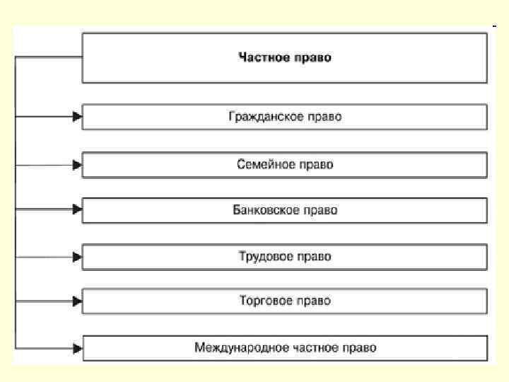 Отрасли права Публичное право – совокупность отраслей права, регулирующих отношения, связанные с обеспечением общего (публичного) или общегосударственного интереса. Конституционное право Муниципальное право Частное право – совокупность норм, регулирующих имущественные и некоторые иные отношения частных лиц, в которых они участвуют как отдельные индивиды. Гражданское право Семейное право Административное право Уголовное право Банковское право Уголовно-исполнительное право Уголовно-процессуальное право Трудовое право Финансовое право Арбитражный процесс Международное публичное право Торговое право Международное частное право