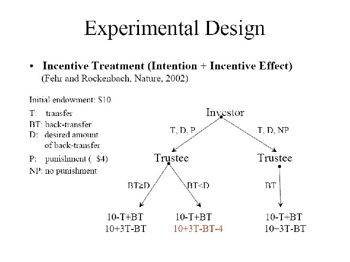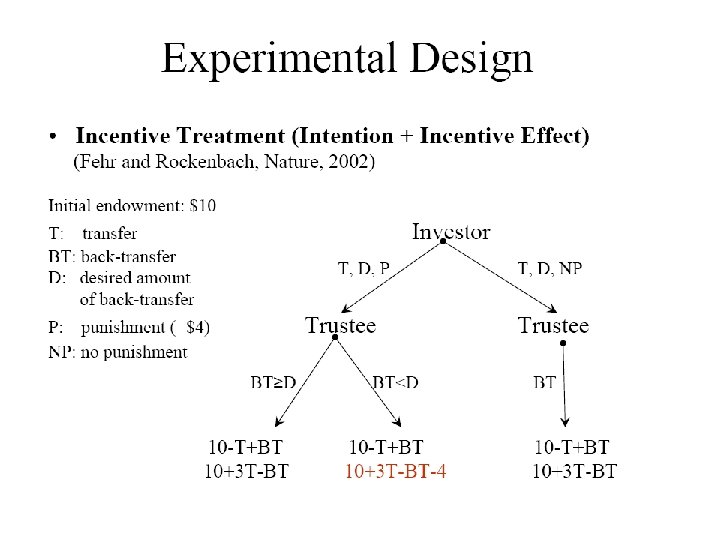 related studies l Detrimental Incentive Effects: Extrinsic incentive tends to reduce intrinsic motivation Frey and Oberholzer-Gee, 1997 Deci, et al, 1999 Gneezy and Rustichini, 2000 l Intention Effects: Imposing sanctions can be seen as a signal of distrust. Fehr and Falk, 2002 Intentions play an important role in shaping decisions. Rabin, 1993 Mc. Cabe, Rigdon and Smith, 2003