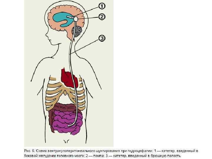 Для отведения ликвора из желудочковой системы головного мозга: 1) Вентрикулоперинеостомия - отведение ликвора из бокового желудочка мозга в брюшную полость (дренажная система снабжена клапанным устройством, которое позволяет поддерживать внутричерепное давление в желудочковой системе на физиологическом уровне и обеспечивает отток ликвора лишь в одном направлении);