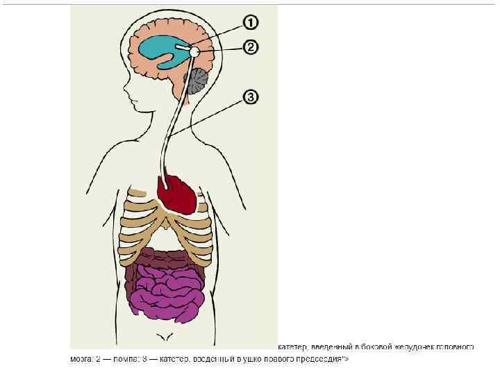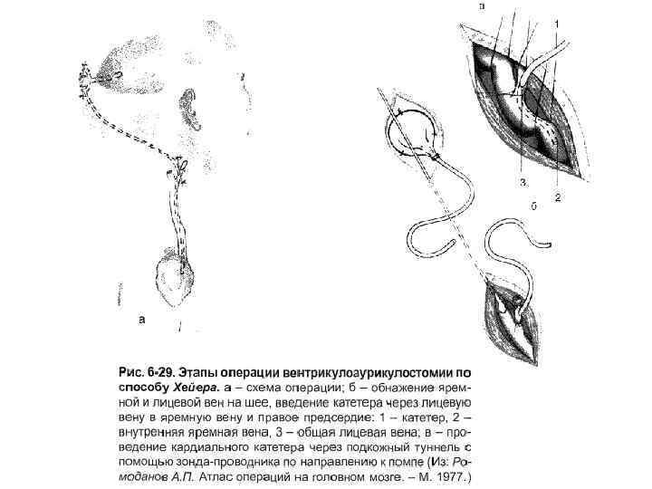 2) Вентрикулоауриколостомия - установка дренажной системы для отведения ликвора из бокового желудочка мозга в правое предсердие. Общие принципы как при вентрикулоперинеостомии. Вскрывают лицевую вену и в её просвет вводят дистальный конец катетера вниз через внутреннюю яремную вену, верхнюю полую вену в правое ушко предсердия.