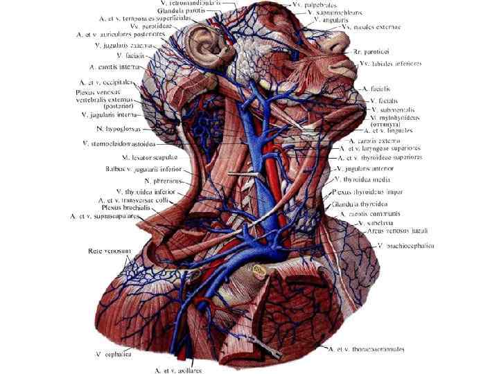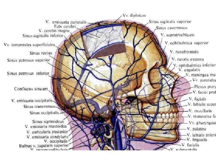 Эмиссарные вены • Теменная эмиссарная вена соединяет через теменное отверстие (foramen parietale) поверхностную височную вену с верхним саггитальным синусом. • Сосцевидная эмиссарная вена соединяет затылочную вену через сосцевидное отверстие (foramen mastoideum) с сигмовидным синусом. • Мыщелковая эмиссарная вена соединяет сигмовидный синус с поверхностными венами затылочной области. • Затылочная эмиссарная вена соединяет затылочную вену с поперечным синусом.